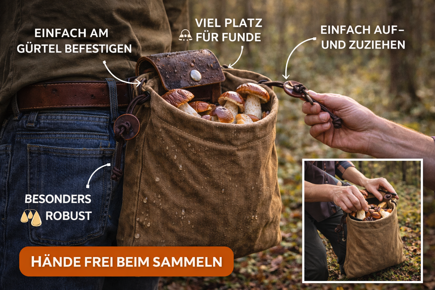 Ideal für Waldspaziergänge, Pilzsaison und Outdoor-Abenteuer.