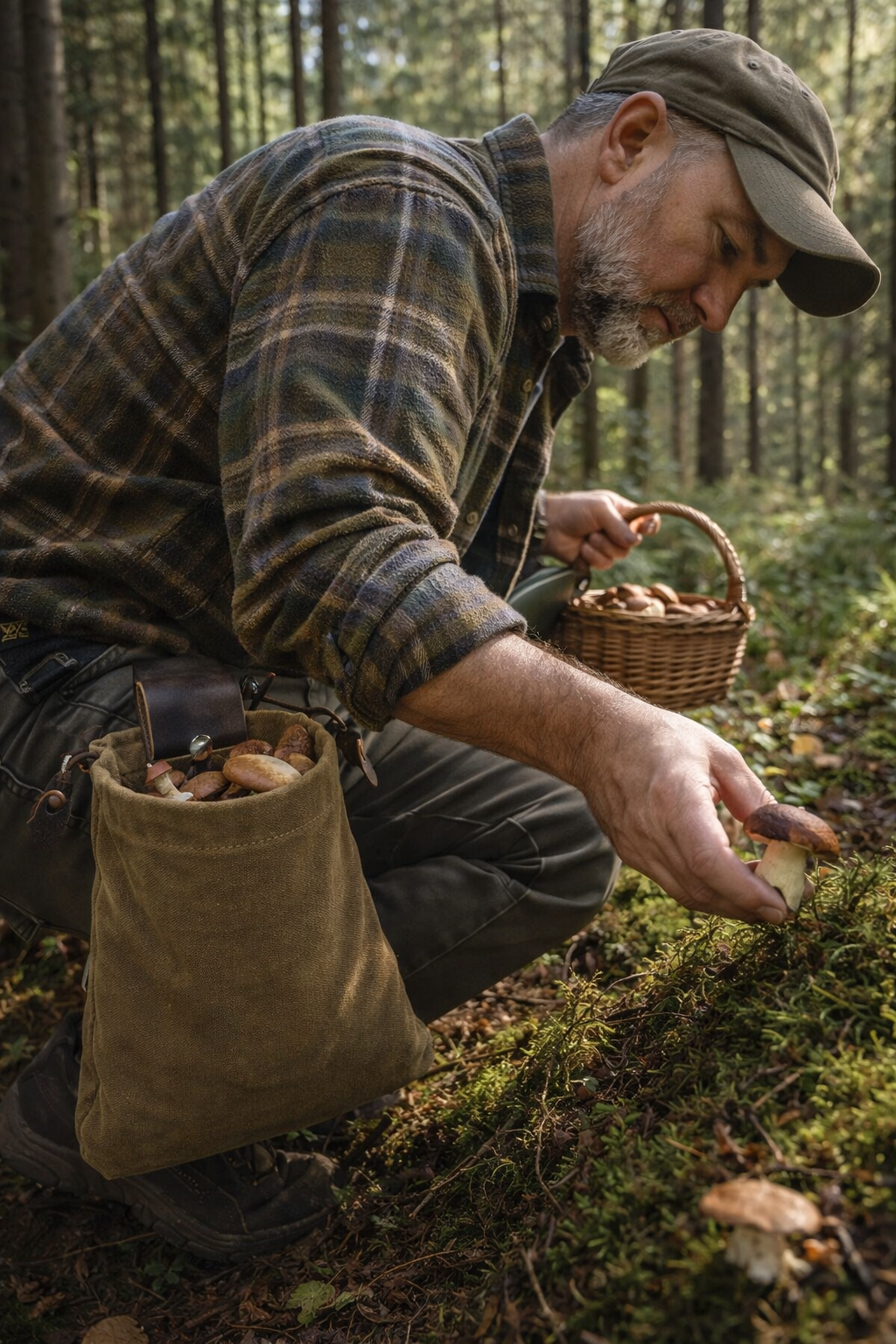 Die WaldPro™ Pilztasche bietet reichlich Platz für eine große Pilzernte während eines Waldspaziergangs.
